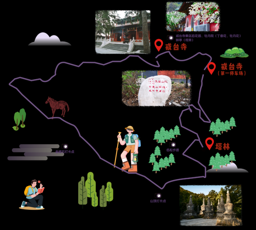 戒台寺景区后花坛、牡丹院(丁香花、牡丹花)、钟亭(不雅景)、名松步谈、山顶打卡点、金蟾石打卡点