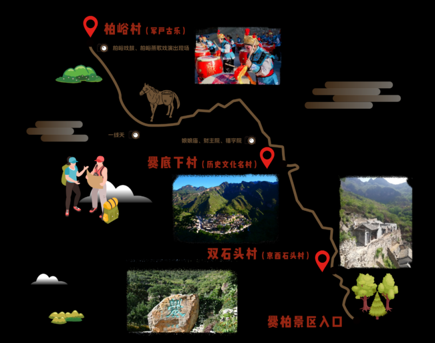 爨柏景区进口→双石头村(京西石头村)→爨下面村(历史文假名村)→柏峪村(军户古乐)