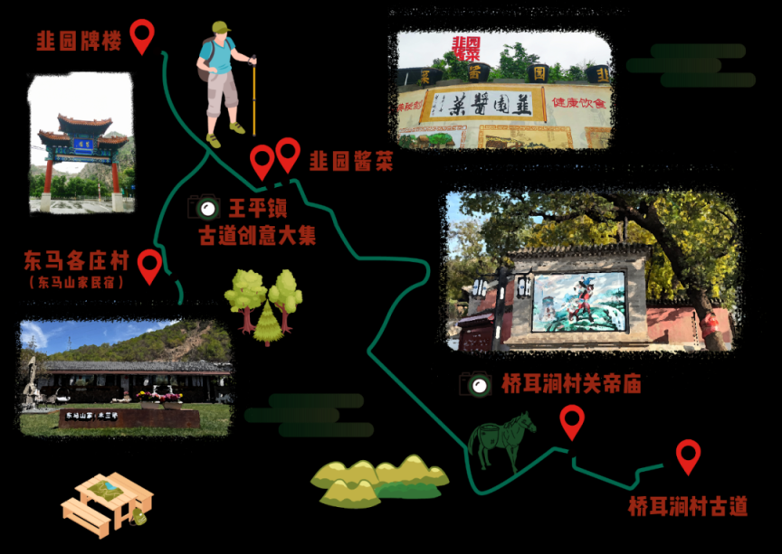 桥耳涧村(桥耳涧村关帝庙、桥耳涧村古谈)→韭园村(王平山趣(古谈创意大集)、韭园酱菜、麦田文化)→东马各庄村(东马山家民宿)→韭园牌坊
