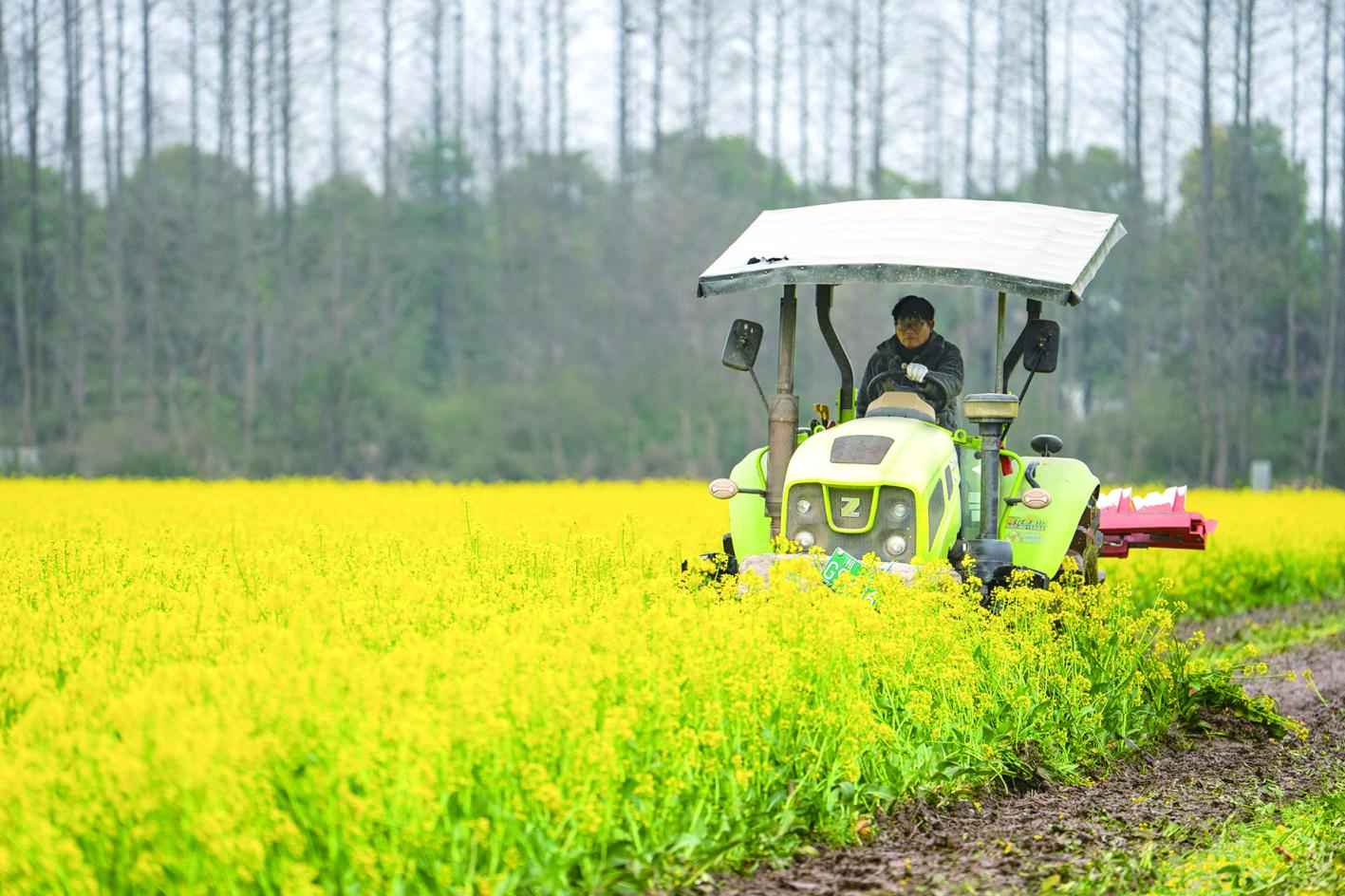 近日,湖南省益阳市沅江市草尾镇村民趁着天气晴好,抢握农时翻耕芥蓝绿肥。新华社记者 陈想汗 摄