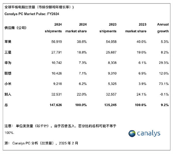 Canalys的最新数据涌现,2024年全球平板电脑商场呈现出正经复苏的态势,全年总出货量达到1.476亿台,同比增长9.2%。在全球平板电脑出货量份额前五名中,苹果以约5691.9万台位居榜首,同比增长5.3%;三星约2779.1万台,同比增长8.2%;华为约1074.2万台,同比增长高达29.3%;联念念约1042.6万台,同比增长12%;小米则约921.8万台,罢了了73.1%的大幅增长。