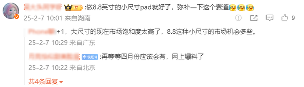 在网友的响应中,有声息敕令REDMI推出更高端的平板居品,指出其他品牌如一加还是推出了订价在两三千元的平板,而REDMI的平板居品似乎仍停留在较为低端的定位,与年青东谈主的需求有所脱节。另一部分网友则抒发了关于小尺寸平板的期待,他们合计,手机游戏屏幕太小,而大尺寸平板又过重,因此但愿REDMI概况推出一款8.8英寸傍边的小平板,性能、充电和屏幕指示自恃平素需求,同期增添电竞属性。